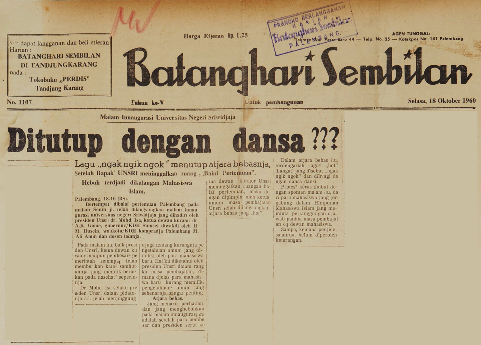 PALEMBANG, KNC.– Dalam percakapan hangat di Grup WA MSI Sumsel. Senin, 8 Desember 2025. Beredar sebuah foto arsip menarik tiba-tiba menjadi pemantik diskusi. Pustakawan Sumsel, Ahmad Subhan, membagikan dokumentasi langka berupa potongan koran Batanghari Sembilan terbitan 18 Oktober 1960. Tajuk yang dibahas pada lembaran lawas tersebut mengisahkan tentang fenomena musik “ngak ngik ngok” dan suasana “hot” yang terjadi di lingkungan Universitas Sriwijaya pada masa itu—tepatnya 65 tahun yang lalu.